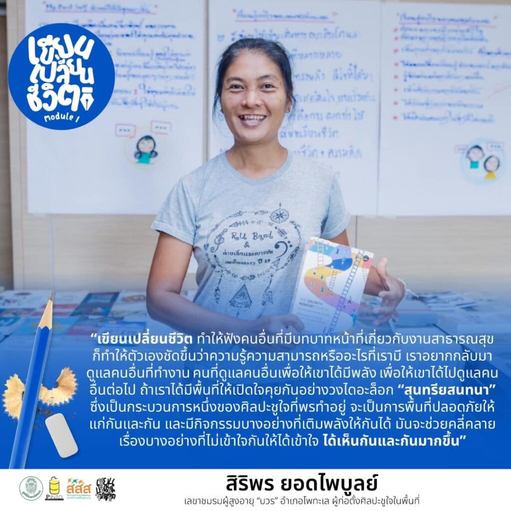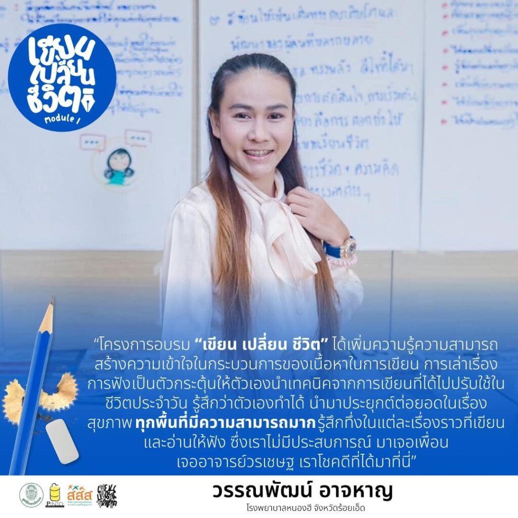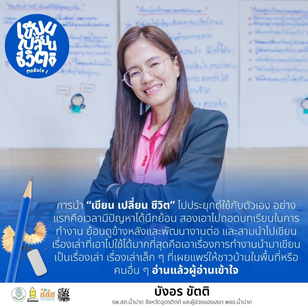 เขียน เปลี่ยน ชีวิต – พรพิมล วงศ์วรรณา “ตอนแรกที่ได้รับคัดเลือกมา เรามีคำถามว่า “เขียน เปลี่ยน ชีวิต” คืออะไร เรากังวลว่าเขียนไม่เก่ง พูดไม่เก่ง แต่อ่านเก่งเพราะชอบอ่านนิยาย การเขียนจึงไม่แน่ใจว่าจะทำได้หรือไม่ พอชั่วโมงแรกที่มาเข้าเรียน อาจารย์วรเชษฐให้เราทบทวนตัวเองว่าอดีตเรามีอะไรน่าจดจำ เราได้เรียนรู้ได้เปิดตัวเองว่าเราก็ทำได้ เราพัฒนา […]